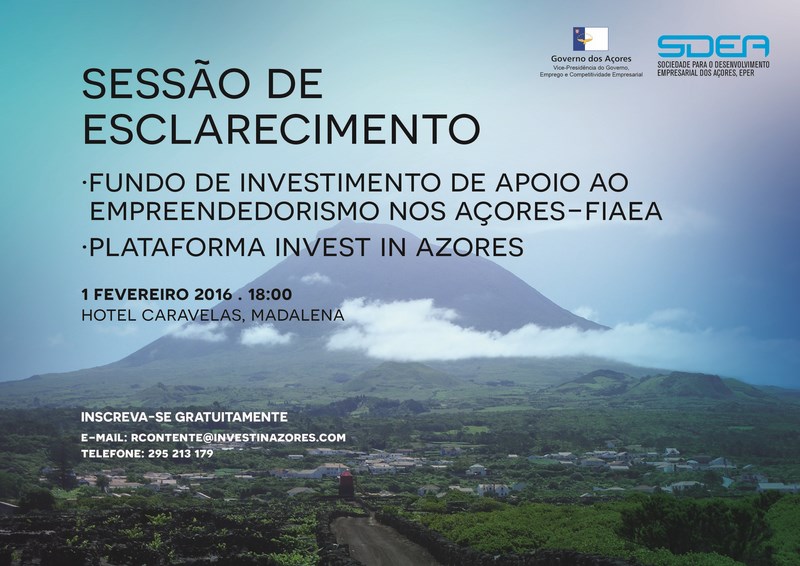 O Departamento de Promoção de Investimentos da SDEA irá promover uma apresentação do FIAEA e da Plataforma InvestinAzores que se irá realizar na Madalena, Ilha do Pico, no dia 1 de Fevereiro às 18h00, no Auditório do Hotel Caravelas.