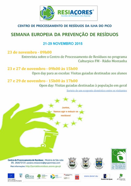 O Centro de Processamento de Resíduos da ilha do Pico está a organizar a Semana Europeia de Prevenção de Resíduos no âmbito da 6ª Edição da Semana de Resíduos dos Açores, promovida pela Secretaria Regional da Agricultura e Ambiente, através da Direção Regional do Ambiente, entre 21 e 29 de novembro de 2015.