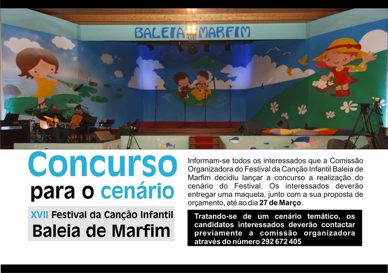 Informam-se todos os interessados que a Comissão Organizadora do Festival da Canção Infantil Baleia de Marfim decidiu lançar a concurso a realização do cenário do Festival.
