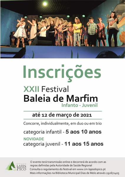 O Município das Lajes do Pico informa todos os interessados que se encontram abertas as inscrições para a XXII edição do Festival da Canção Baleia de Marfim que, este ano, devido à situação de pandemia COVID-19, será realizado em formato online.