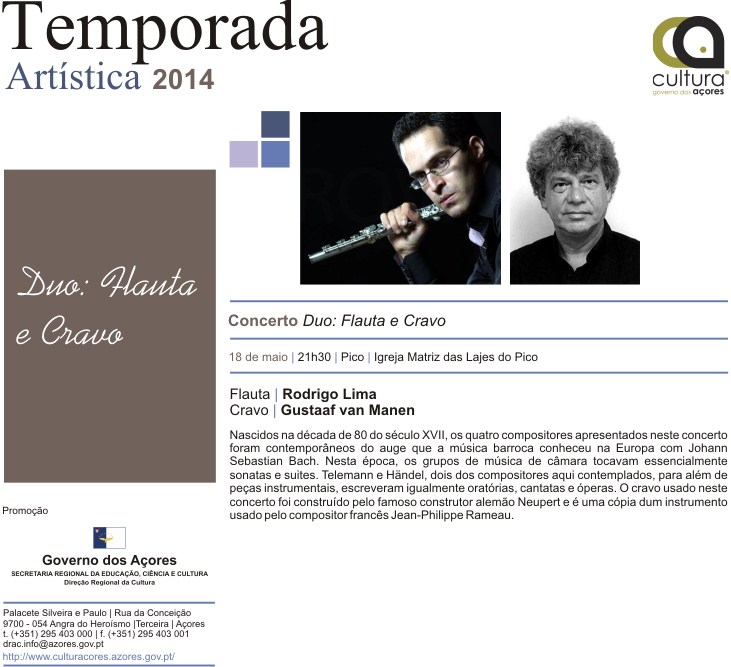 No âmbito da Temporada Artística 2014, a Secretaria Regional da Educação, Ciência e Cultura, através da Direção Regional da Cultura, promove, no próximo dia 18 de maio, pelas 21h30, na Igreja das Lajes do Pico, a realização de um Concerto pelo Duo: Flauta e Cravo, com a presença dos intérpretes Rodrigo Lima e Gustaaf van Manen.