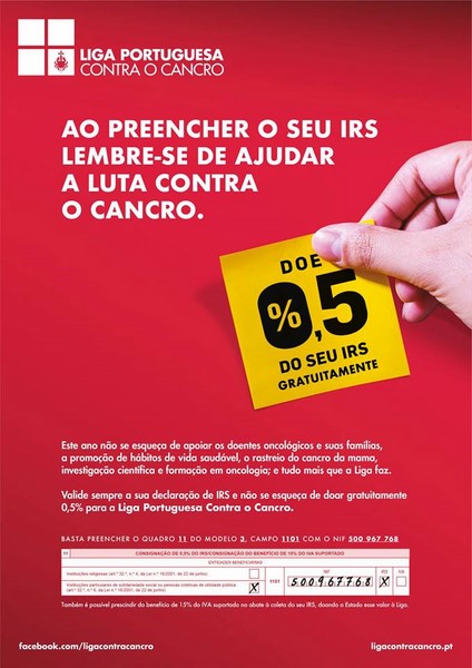 Ao submeter a sua declaração de IRS lembre-se de ajudar a luta contra o cancro preenchendo o campo 1101 do quadro 11 do modelo 3 e indicando o NIF 500 967 768 correspondente à Liga Portuguesa Contra o Cancro.