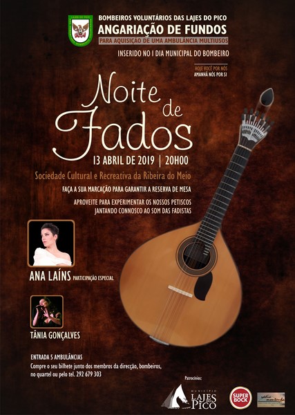 A Associação Humanitária dos Bombeiros Voluntários de Lajes do Pico, visando a angariação de fundos para aquisição de uma ambulância multiusos, promove uma Noite de Fados, inserida no I Dia Municipal do Bombeiro.