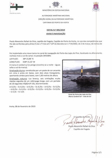 Paulo Alexandre Rafael da Silva, capitão-de-fragata, Capitão do Porto da Horta, no uso das competências que lhe são conferidas pela alínea h) do n.º 4 do art.º 13º do Decreto-Lei n.º 44/2002, de 2 de março, dá notícia de que foi implantada uma nova marca no canal de navegação do Porto das Lajes do Pico, localizada no afloramento rochoso mais a sul do canal, na posição (WGS84):