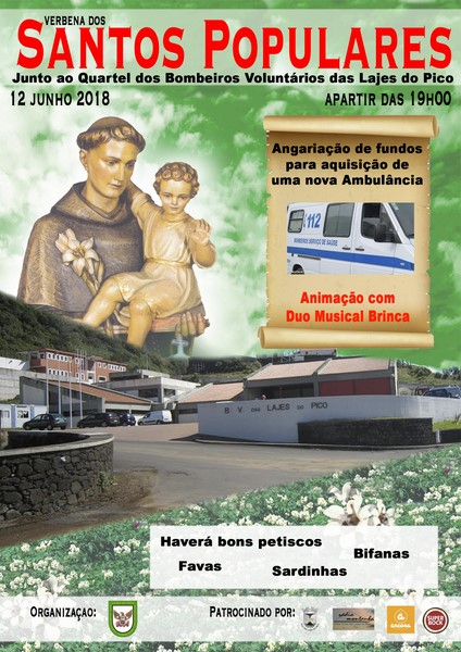 Os Bombeiros Voluntários das Lajes do Pico organizam no próximo dia 12 de junho, a partir das 19 horas, uma verbena dos Santos Populares junto ao quartel dos bombeiros que contará com a animação do Duo Musical Brinca.