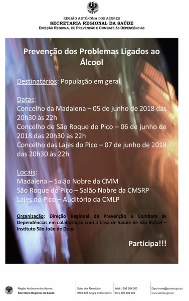O Município das Lajes do Pico convida toda a população a participar na palestra subordinada à temática "Prevenção dos Problemas Ligados ao Álcool" que se realiza hoje, 7 de junho, entre as 20h30 e as 22h00, no Auditório Municipal.