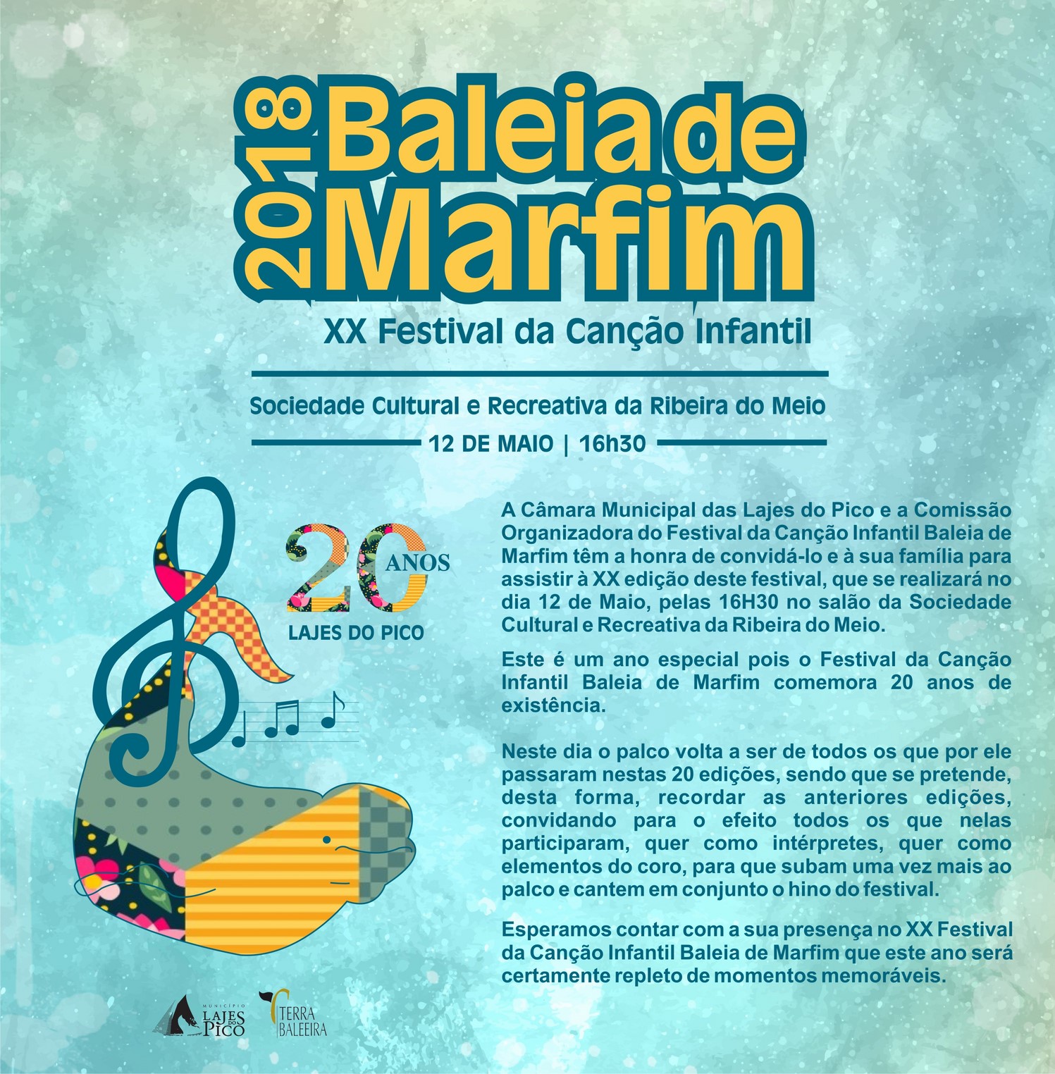 A Câmara Municipal das Lajes do Pico e a Comissão Organizadora do Festival da Canção Infantil Baleia de Marfim têm a honra de convidá-lo e à sua família para assistir à XX edição deste festival, que se realizará no salão da Sociedade Cultural e Recreativa da Ribeira do Meio.