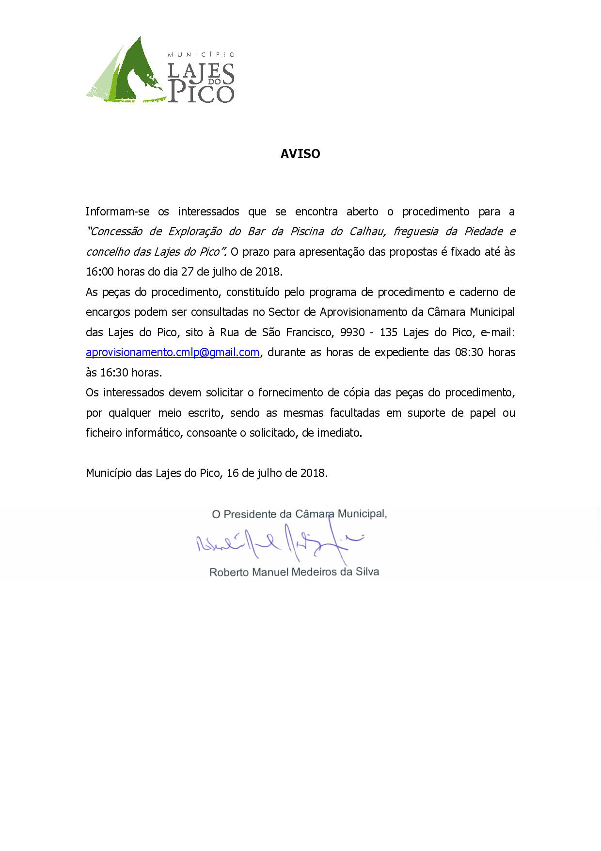 Informam-se os interessados que se encontra aberto o procedimento para a “Concessão de Exploração do Bar da Piscina do Calhau, freguesia da Piedade e concelho das Lajes do Pico”. O prazo para apresentação das propostas é fixado até às 16:00 horas do dia 27 de julho de 2018.