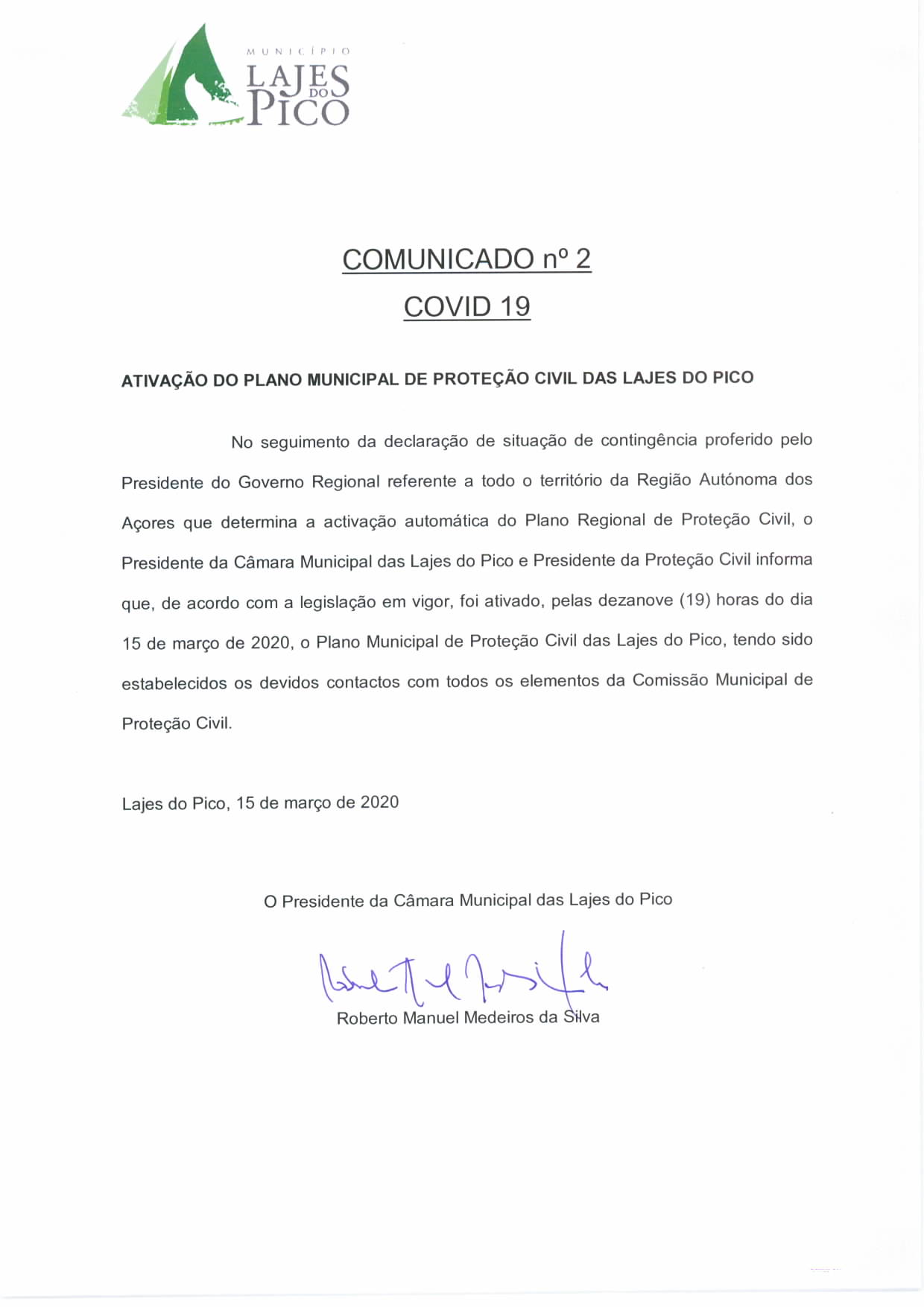 Comunicado Nº 2 - Ativação Do Plano Municipal De Proteção Civil Das Lajes Do PicoNo seguimento da declaração de situação de contingência proferido pelo Presidente do Governo Regional referente a todo o território da Região Autónoma dos Açores que determina a activação automática do Plano Regional de Proteção Civil, o Presidente da Câmara Municipal das Lajes do Pico e Presidente da Proteção Civil informa que, de acordo com a legislação em vigor, foi ativado, pelas dezanove (19) horas do dia 15 de março de 2020, o Plano Municipal de Proteção Civil das Lajes do Pico, tendo sido estabelecidos os devidos contactos com todos os elementos da Comissão Municipal de Proteção Civil.