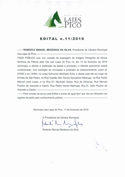 A Câmara Municipal das Lajes do Pico vem por este meio informar que por ocasião da passagem da Imagem Peregrina de Nossa Senhora de Fátima pela Vila das Lajes do Pico o trânsito automóvel estará condicionado no dia 14 de fevereiro de 2016.